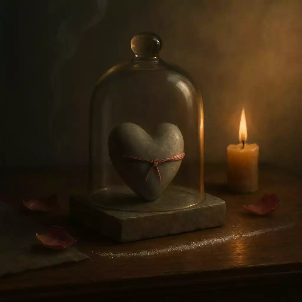 Premium spiritual still life symbolizing love-spell influence as calm containment—heart stone, rose thread, beeswax candle glow, and subtle incense smoke on an altar surface.
